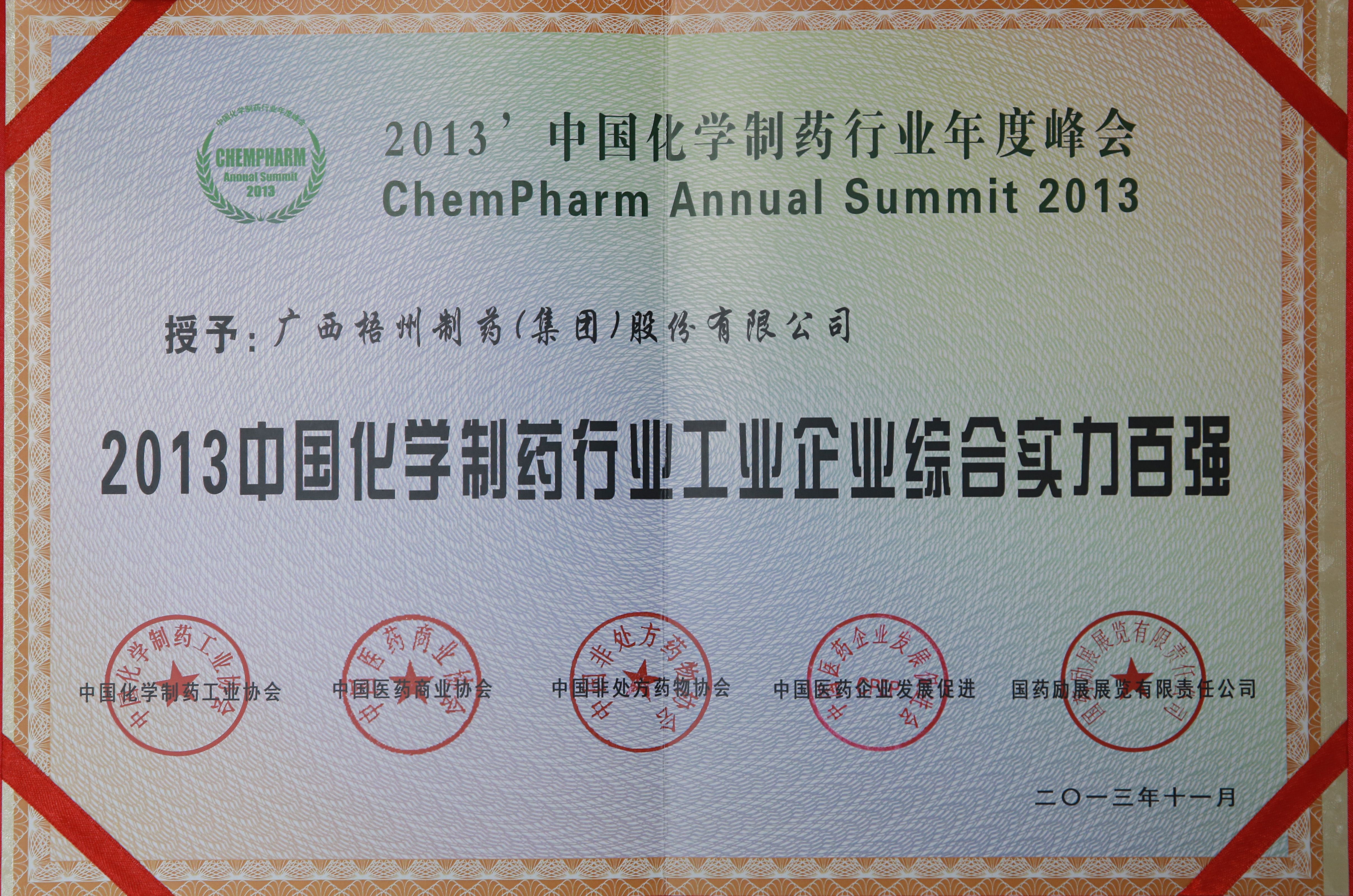 2013年度評(píng)選為中國(guó)化學(xué)制藥行業(yè)工業(yè)企業(yè)綜合實(shí)力百?gòu)?qiáng)