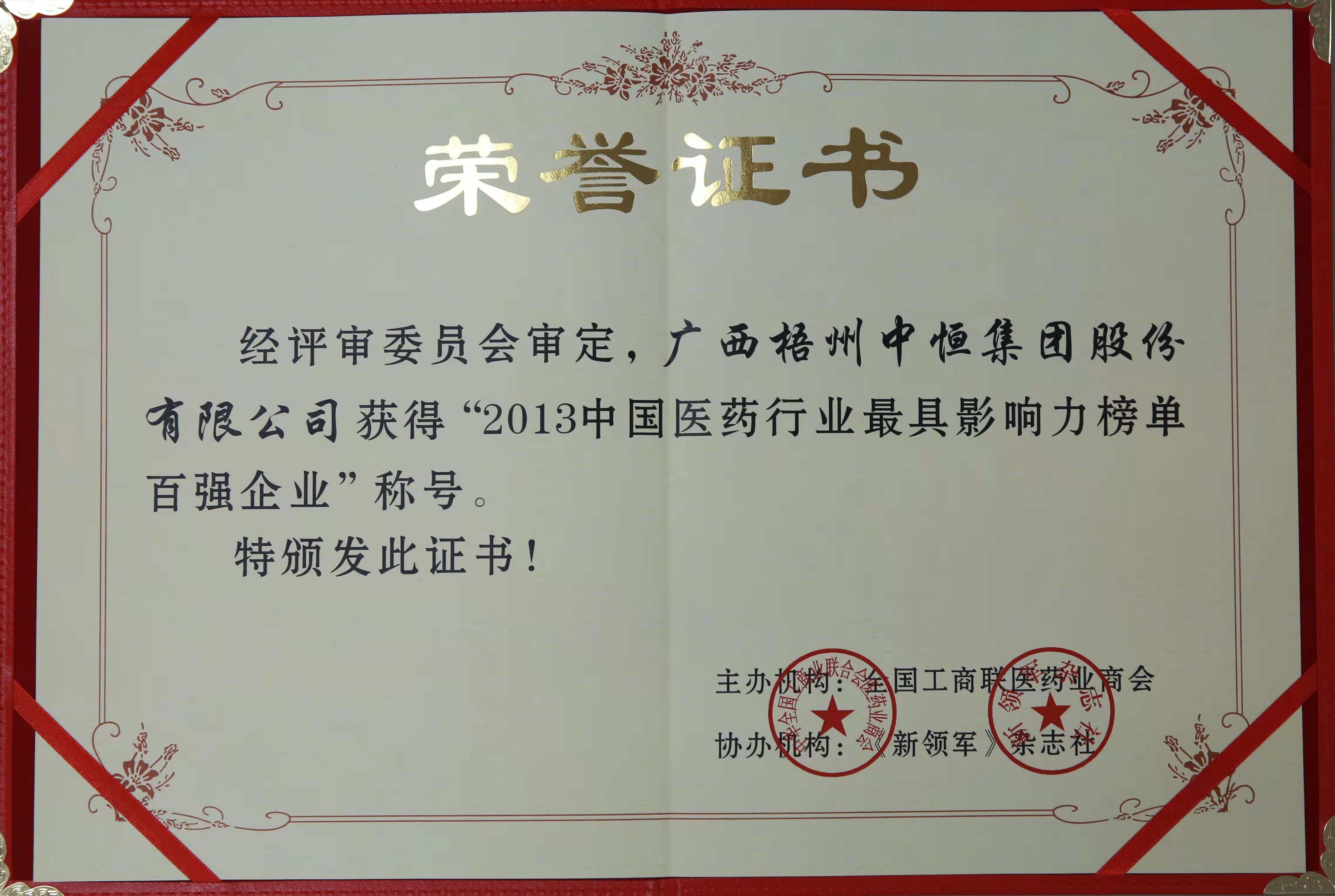 榮獲“2013年中國醫藥行業最具影響力百強企業”稱號