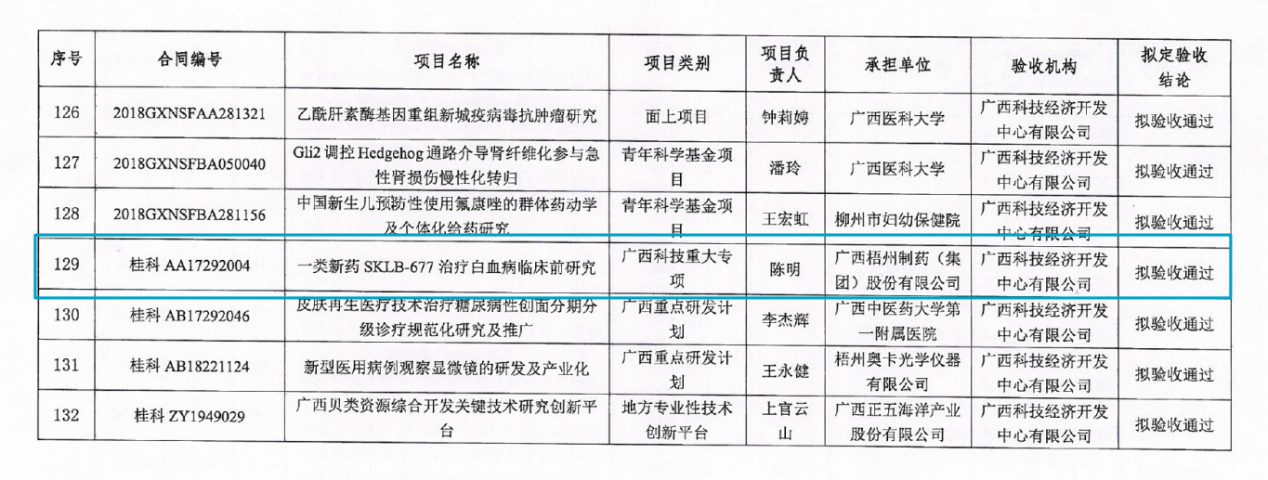 根據廣西科技項目評估中心發布的“廣西科技計劃項目擬定驗收結論公示”(公示期:2022年7月22日—28日),中恒集團梧州制藥承擔的廣西科技重大專項《一類新藥SKLB677治療白血病的臨床前研究》項目通過驗收。