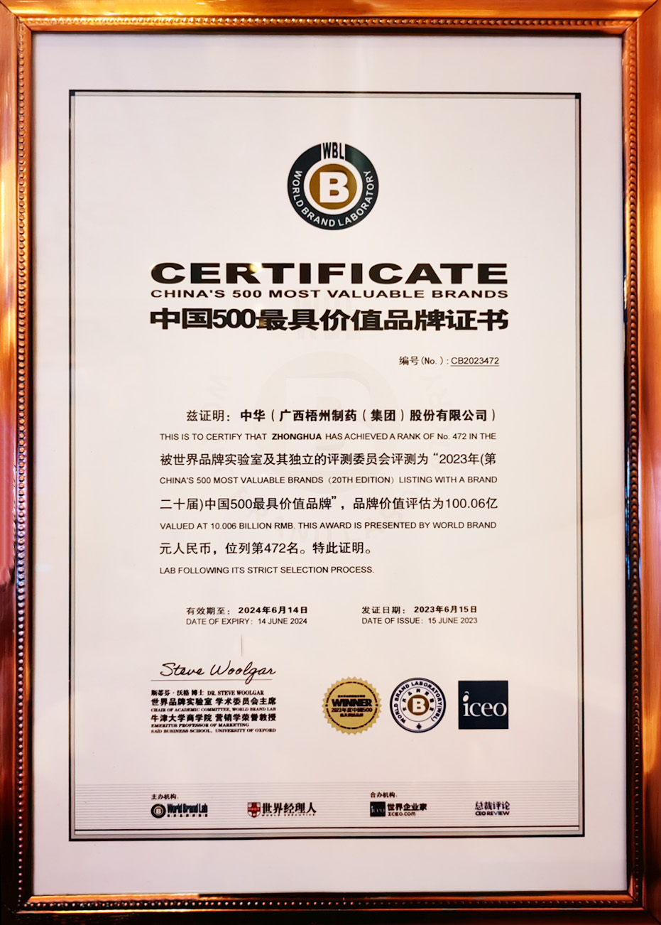 早在2021年,中國品牌建設促進會已將“中華”品牌列入“中華老字號”組50強,品牌價值為70.52億元。2023年,“中華”品牌經世界品牌實驗室及其獨立的評測委員會評測認證,成功入選2023年(第二十屆)中國500最具價值品牌,獲此殊榮,是世界品牌實驗室對梧州制藥持續(xù)推進“中華”品牌建設,實現(xiàn)品牌價值不斷提升的充分肯定。同時,彰顯了公司穩(wěn)健的發(fā)展態(tài)勢和強勁的品牌實力。