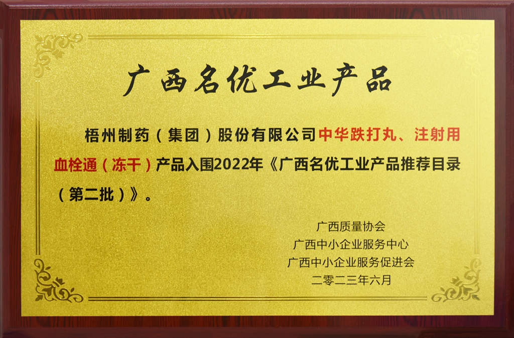 廣西梧州制藥(集團)股份有限公司中華跌打丸、注射用血栓通(凍干)產品入圍2022年《廣西名優工業產品推薦目錄(第二批)》