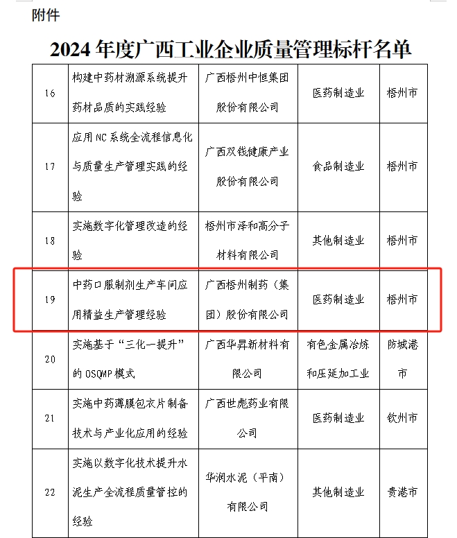 近日,廣西壯族自治區(qū)工業(yè)和信息化廳公布了2024年度廣西工業(yè)企業(yè)質(zhì)量管理標(biāo)桿名單,梧州制藥“中藥口服制劑生產(chǎn)車間應(yīng)用精益生產(chǎn)管理經(jīng)驗(yàn)”成功入選,公司連續(xù)第三年榮獲“廣西工業(yè)企業(yè)質(zhì)量管理標(biāo)桿”稱號(hào)。