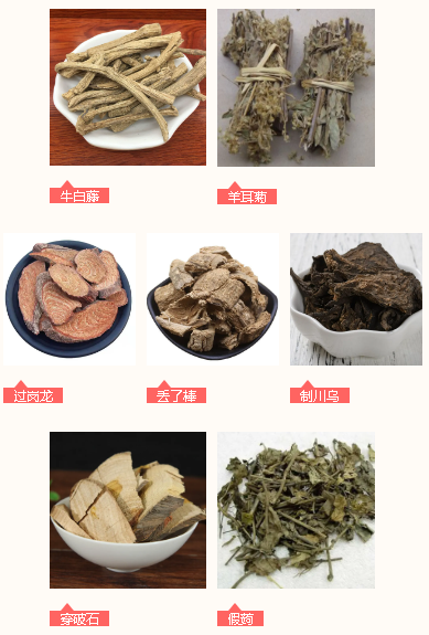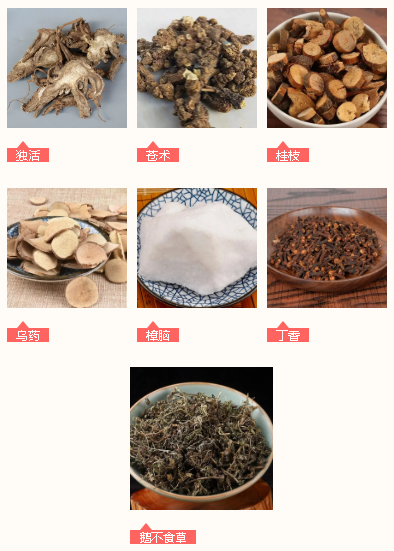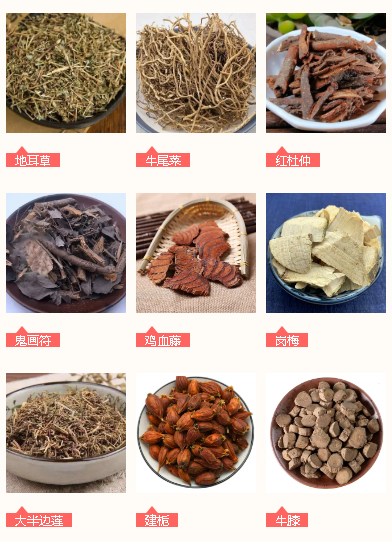 佐使藥:地耳草、牛尾菜、紅杜仲、鬼畫符、雞血藤、崗梅、大半邊蓮、建梔、牛膝、獨活、蒼術、桂枝、烏藥、樟腦、丁香、鵝不食草。