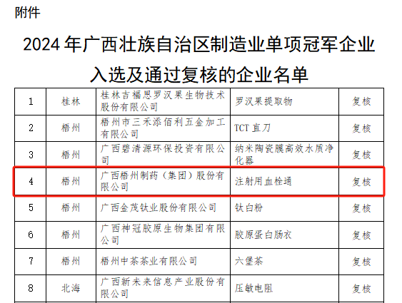 近日,廣西壯族自治區(qū)工業(yè)和信息化廳公布2024年廣西壯族自治區(qū)制造業(yè)單項(xiàng)冠軍企業(yè)名單,梧州制藥憑借著冠軍產(chǎn)品注射用血栓通卓越的技術(shù)能力和市場(chǎng)競(jìng)爭(zhēng)力,順利通過(guò)了每三年一次的復(fù)核評(píng)價(jià)。