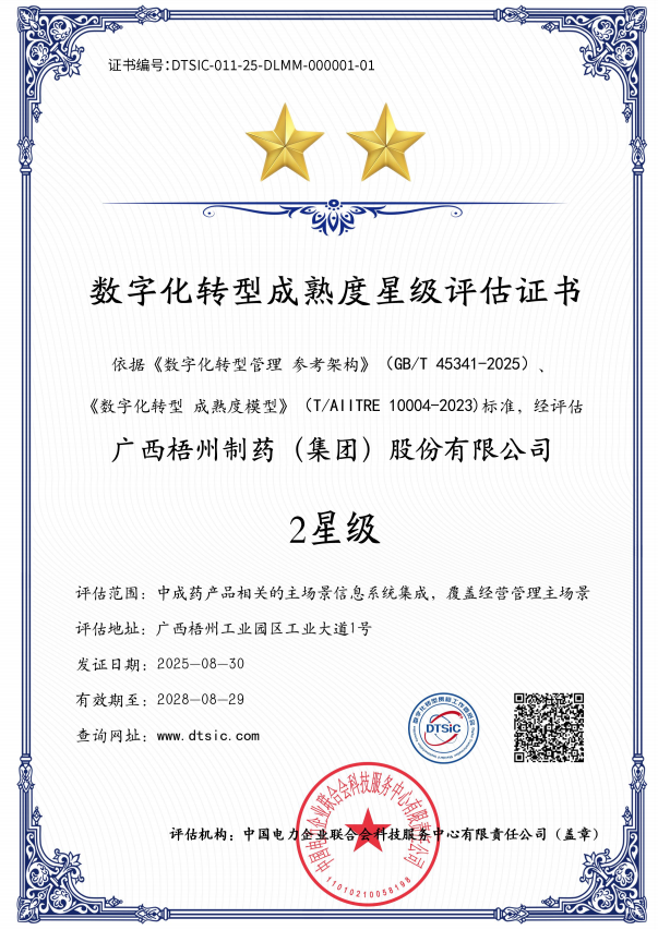 近日,數字化轉型貫標工作委員會公布第十九批數字化轉型貫標星級評估結果,廣西梧州制藥(集團)股份有限公司憑借扎實的轉型實踐與顯著成效,成功獲評數字化轉型成熟度2星級認證,成為中醫藥行業數字化轉型進程中的優秀代表。該榮譽不僅是對企業過往轉型工作的權威認可,更為行業同仁推進數字化轉型提供了可參考的實踐路徑。