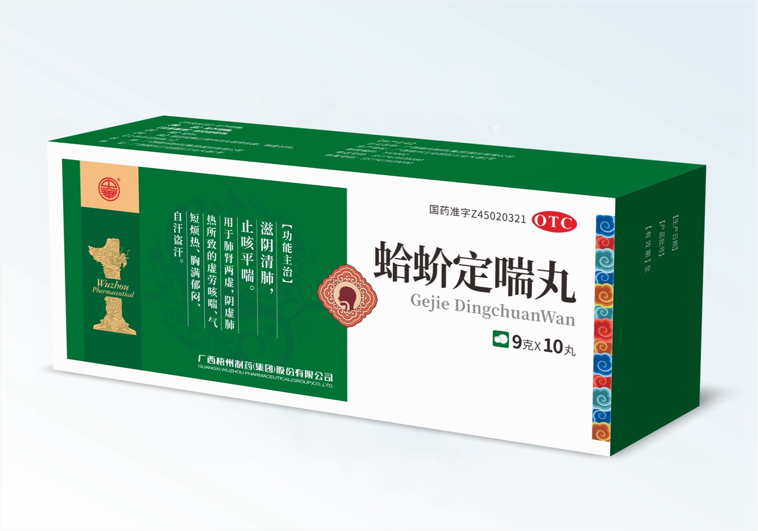 【藥品名稱】通用名稱:蛤蚧定喘丸漢語拼音:Gejie DingchuanWan【成份】蛤蚧、瓜萎子、紫菀、麻黃、醋鱉甲、黃苓、甘草、麥冬、黃連、百合、炒紫蘇子石膏、炒苦杏仁、煅石膏。輔料為蜂蜜。【性狀】本品為黑褐色的大蜜