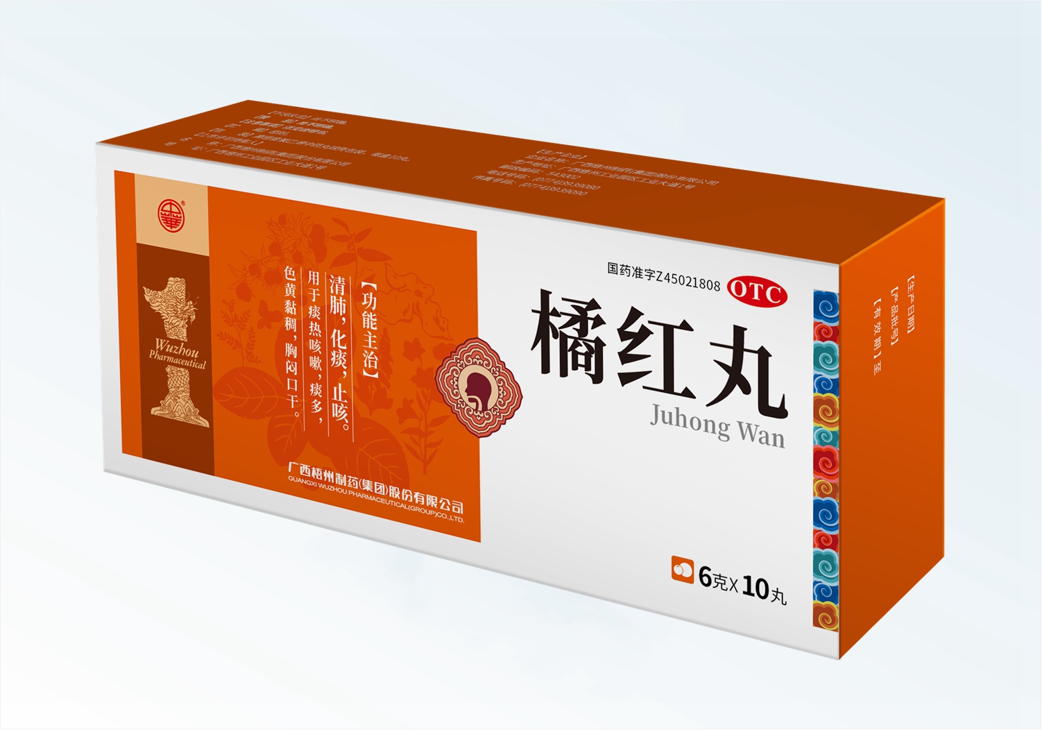 【藥品名稱】通用名稱:橘紅丸漢語拼音:JuhongWan【成份】化橘紅、陳皮、半夏(制)、茯苓、甘草、桔梗、苦杏仁、炒紫蘇子、紫菀、款冬花、瓜蔞皮、浙貝母、地黃、麥冬、石膏。輔料為蜂蜜。【性